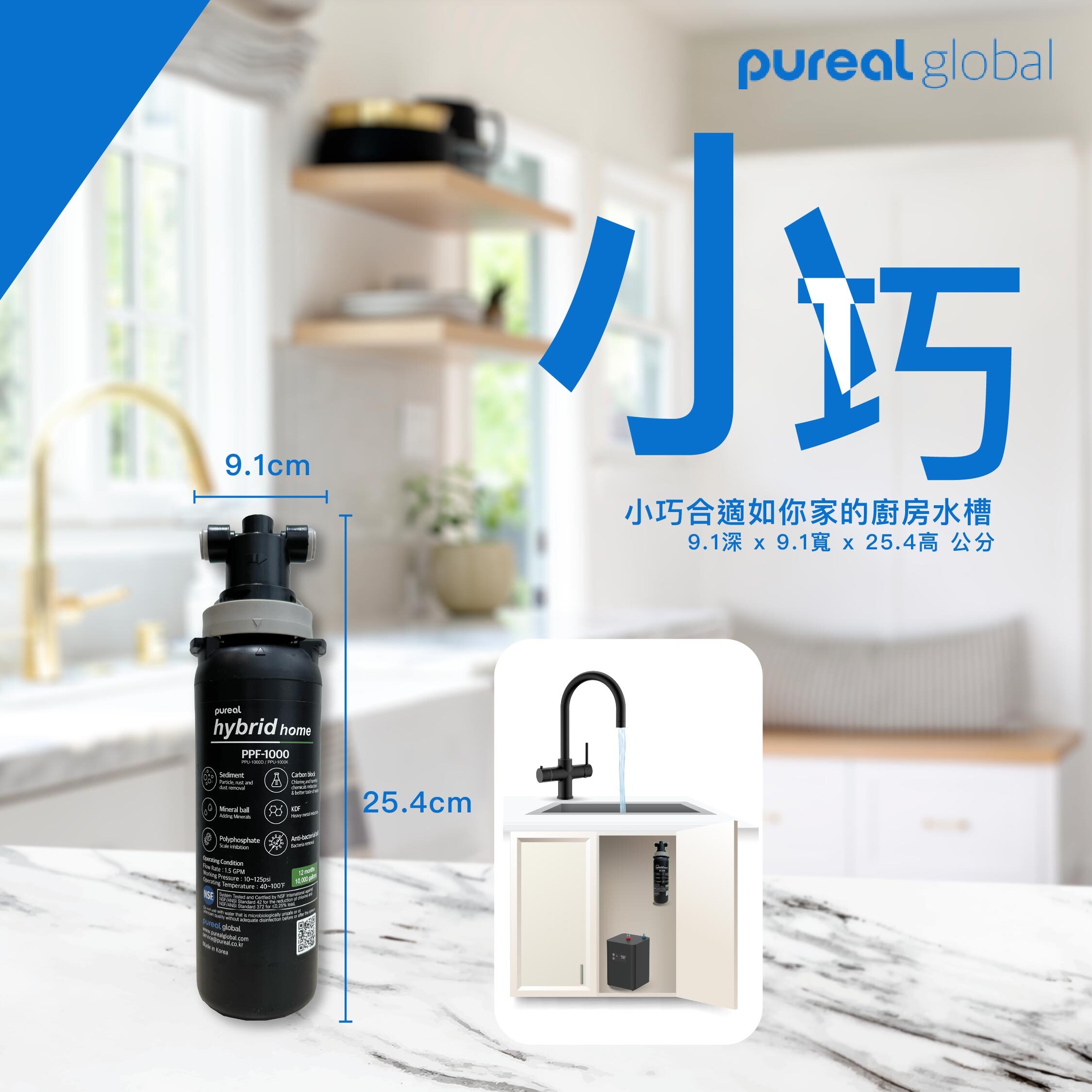 採用 PP、POM、EPDM、矽膠等食品級材質,濾芯壽命可達 12 個月;機身僅 95×97×326mm,適合家用或廚房龍頭配套使用