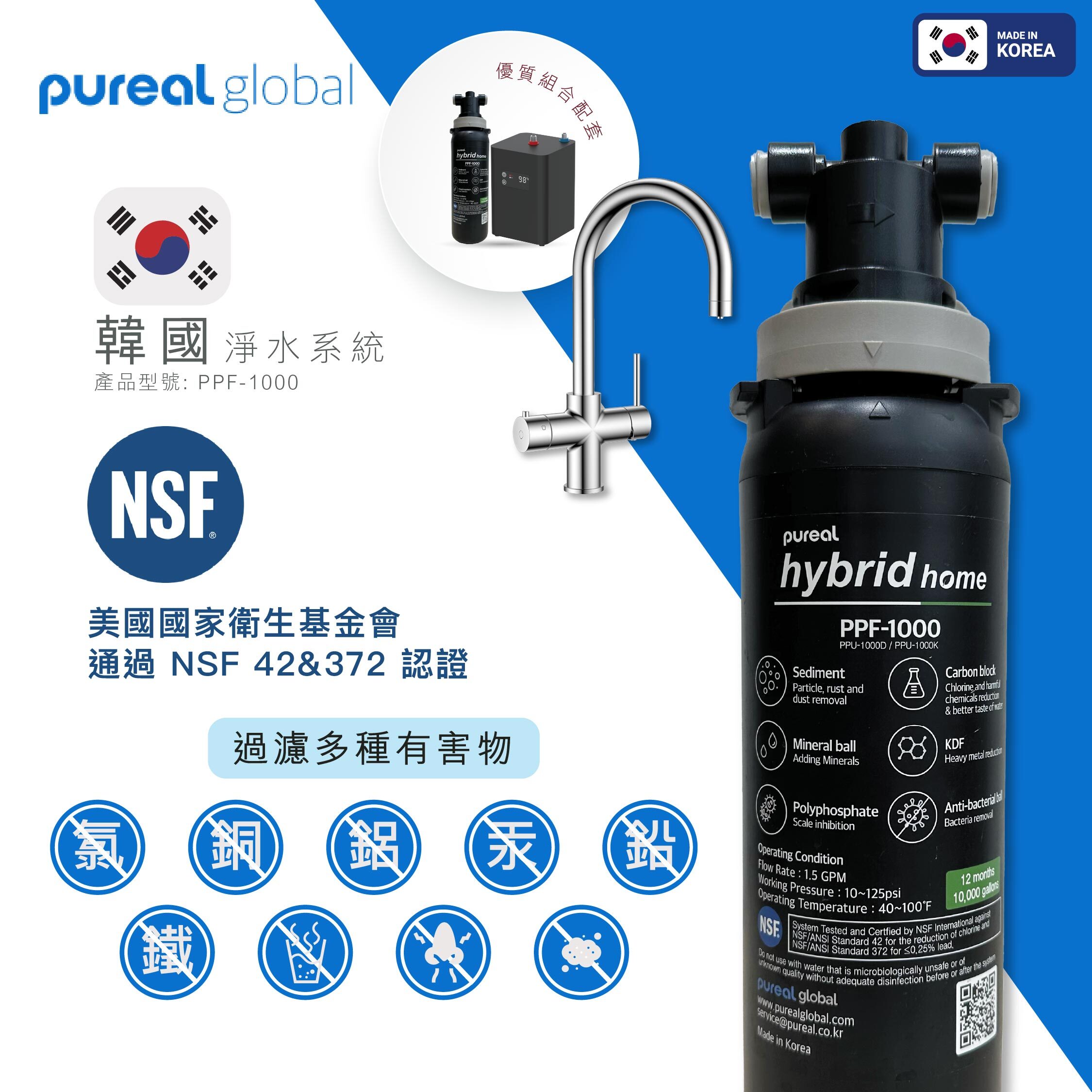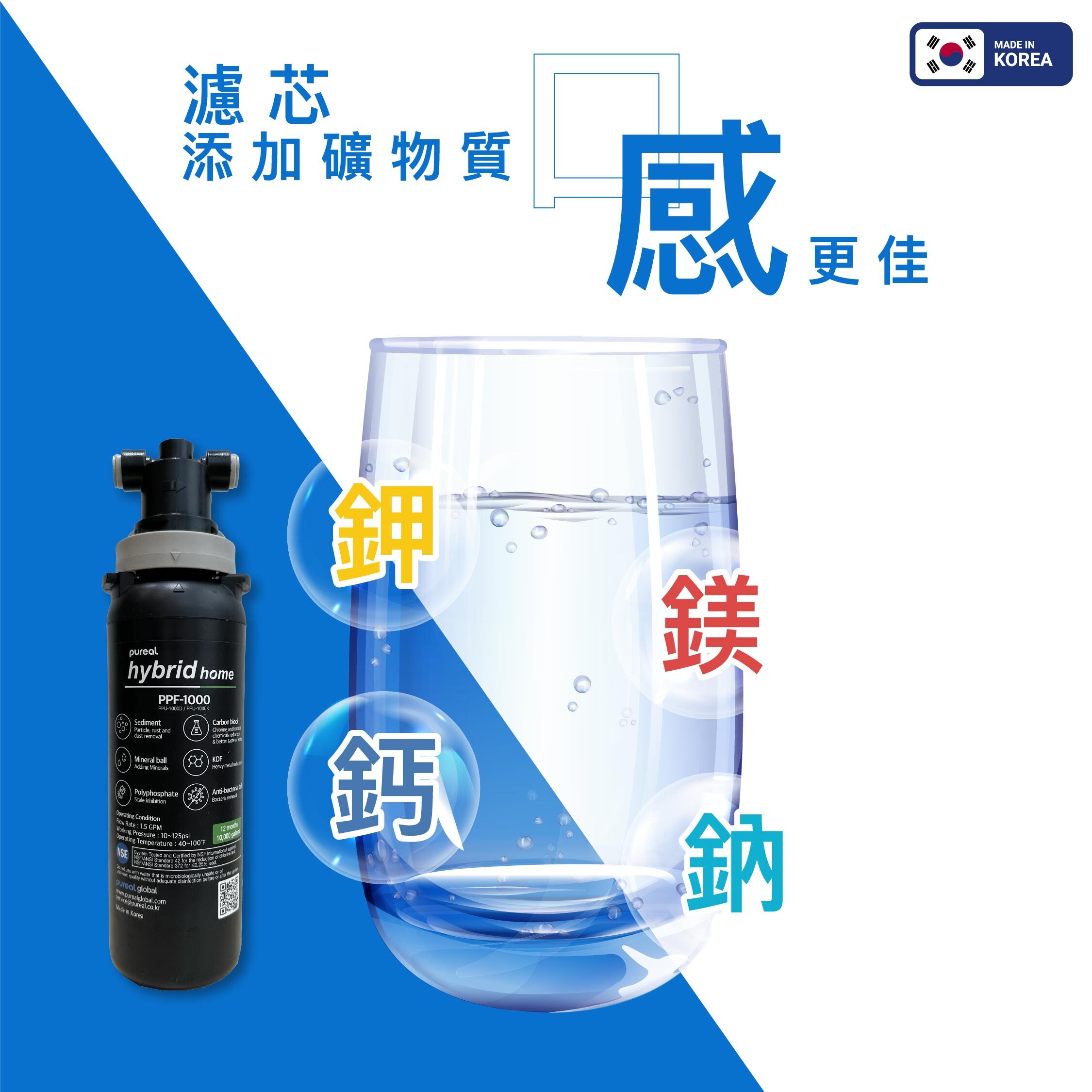 濾芯可釋放 K、Mg、Ca、Na,提升飲用口感與日常礦物攝取,並通過 NSF 42 & 372 認證,飲用更安心