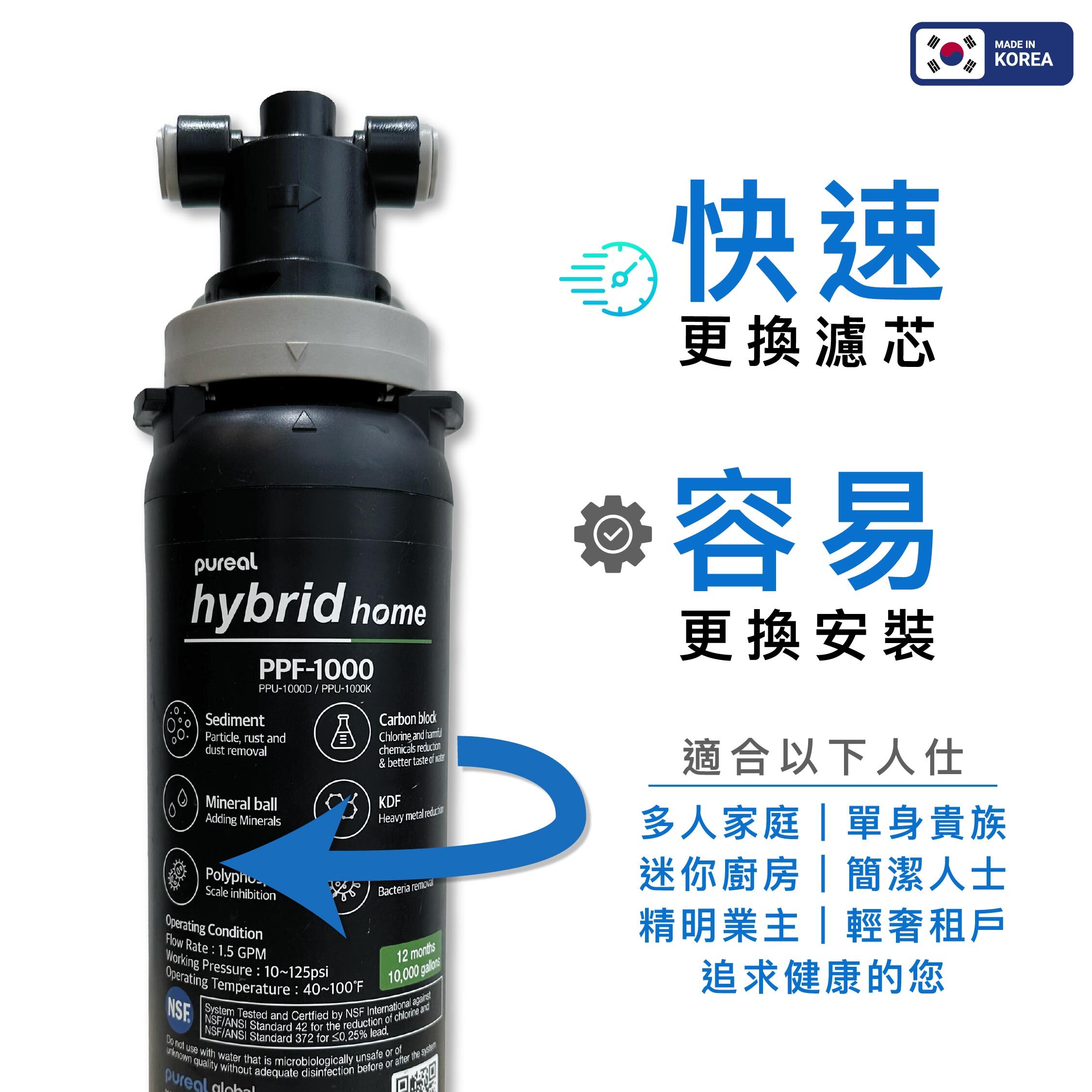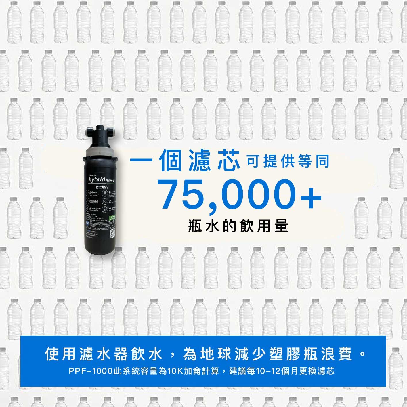 • 濾芯容量: 10,000 加侖過濾水, 能使用12個月