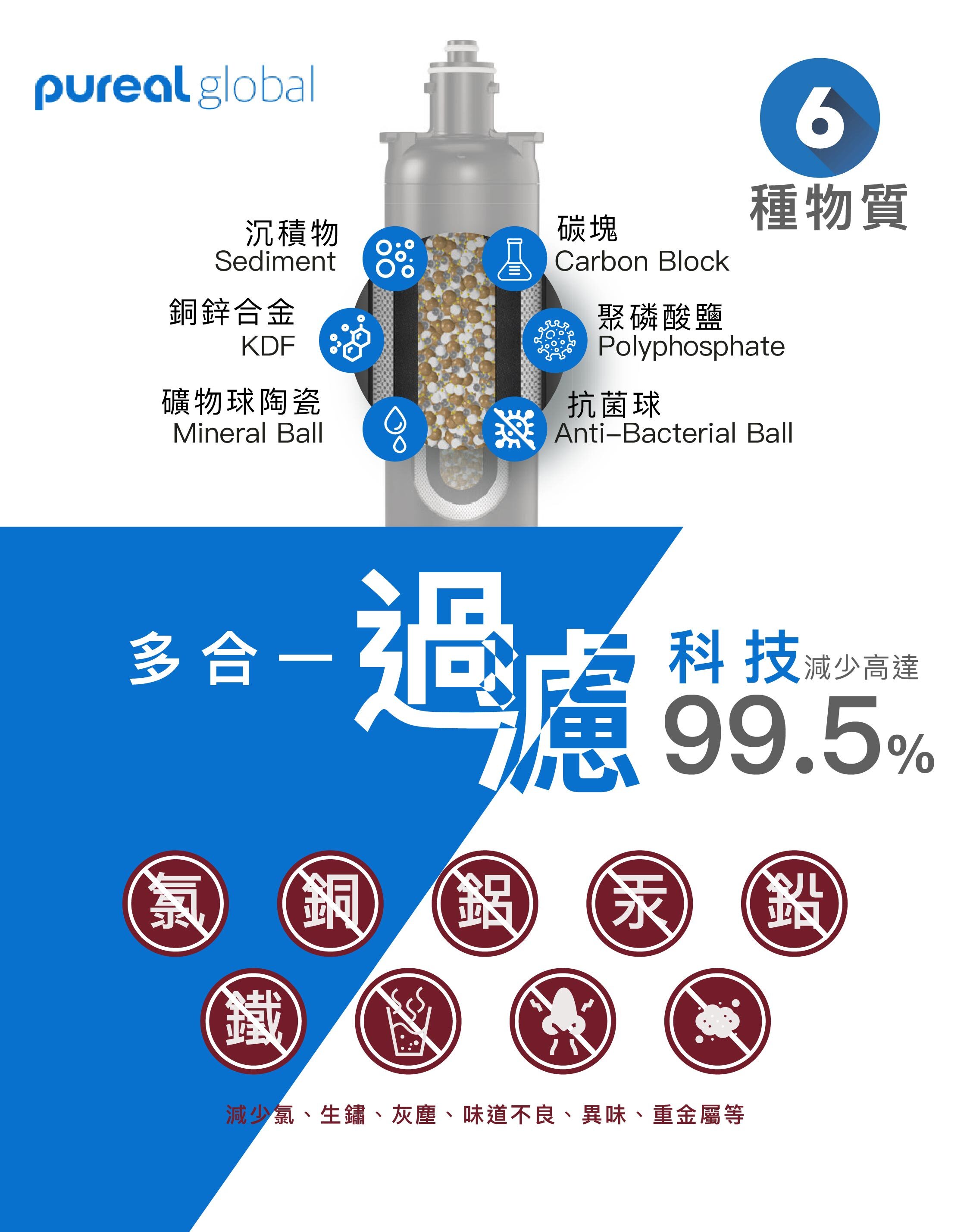 結合沉積物、活性碳、KDF、聚磷酸鹽、礦物球與抗菌球,有效去除鐵鏽、重金屬、餘氯、異味、細菌與 VOC,同時抑制水垢形成
